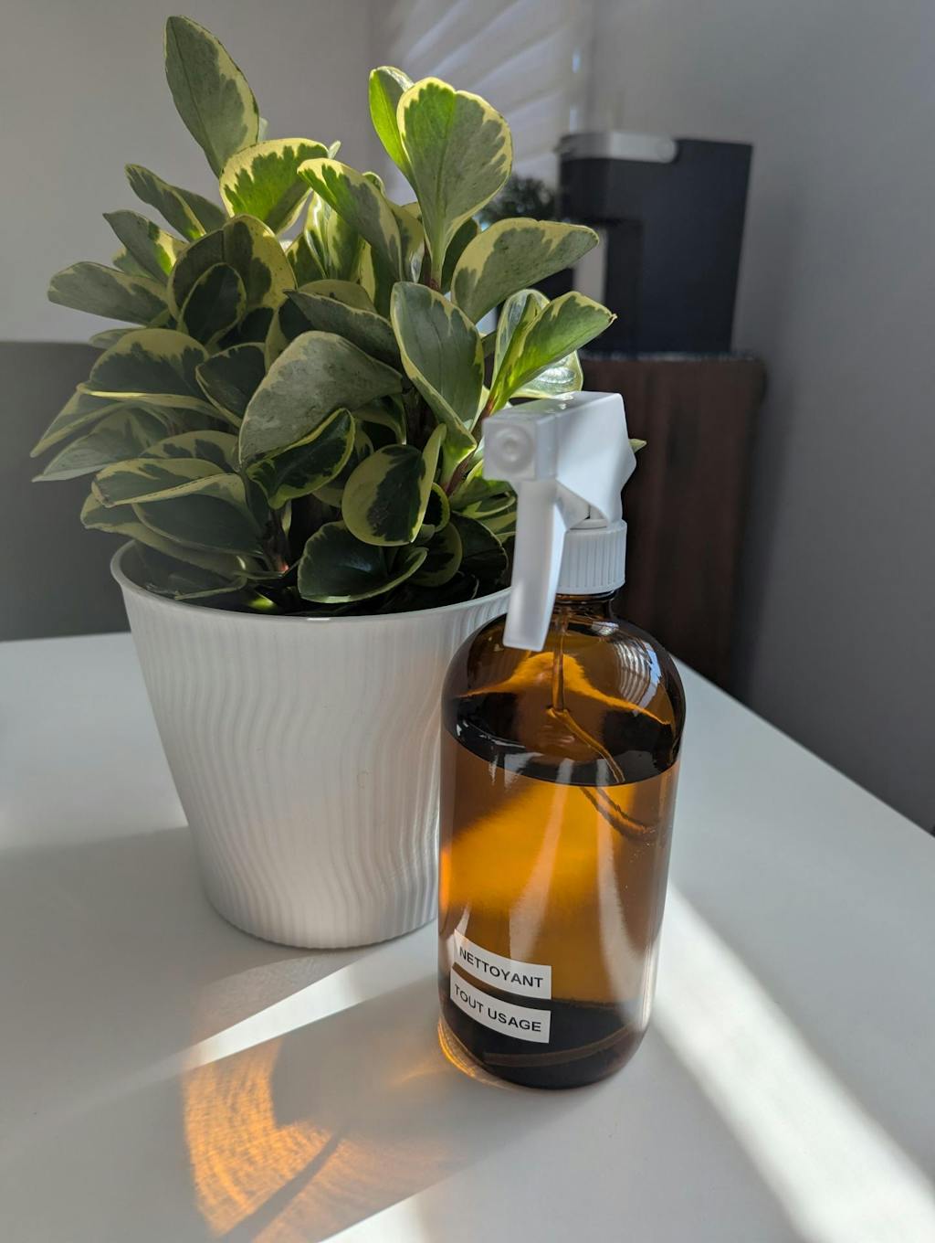Bouteille en verre ambré avec vaporisateur. Parfaite pour tes recettes de produits ménagers maison!