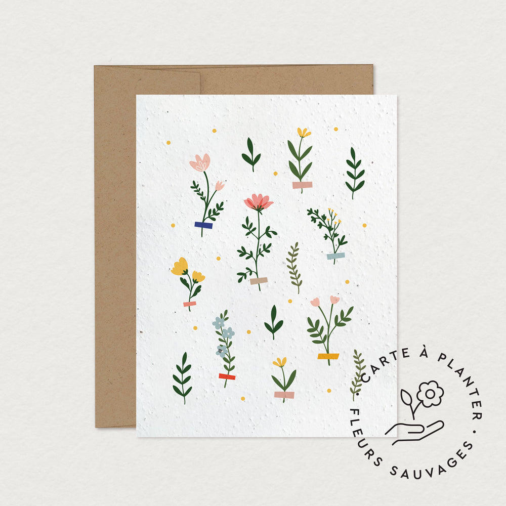 Carte de voeux faite de carton ensemencé (fleurs sauvages: Silène, Alysson maritime, Muflier, Gilia Tricolore, Rudbeckie hérissée, Clarkia), produite au Canada. Fabriquée à partir de matériaux recyclés post-consommation. Enveloppe faite de papier kraft 100% recyclé